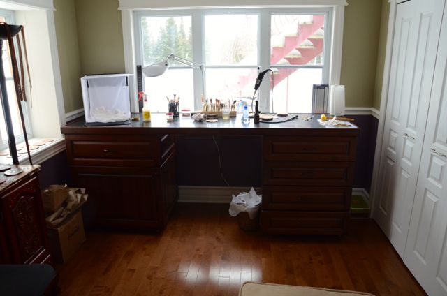 I took over a spare bedroom for my studio. I made the move after my hobby began to take over the kitchen… I had plastic totes around the table, which was perpetually cluttered with leather “stuff”. I love having the space to spread out, with plenty of cupboards, drawers, and even a closet to store my tools, liquids, and leather. I have a lovely view of the Laurentides mountains, with the entertaining sight of my Saluki dogs as they play in the fenced yard. The workbench is 8 by 3 feet and the top is made of granite. It’s at elbow height so I can work comfortably while standing or sitting in a draft chair.