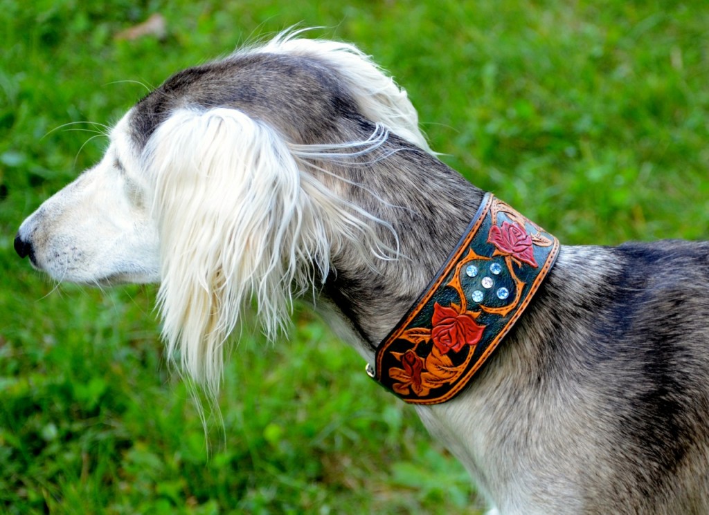 In my quest for the perfect dog collar, I was surprised to be unable to find one with the rustic durability of leather, an interesting design, in a size and shape that would suit my dogs, and for a reasonable price. I thus endeavouredย to craft one myself. With the aid of books, friends, trial and error, and the Internet, the support of my loving husband, and a lot of new tools, I garnered the skills to craft my very own personalized collar, which my Saluki still wears to this day. I had so much fun that I continue to come up with new designs and custom-craft collars for other dogs through Etsy.com.