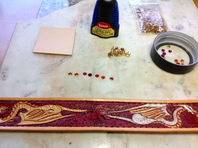 Before the leather is dry, brush a layer of glue on both the front of the metal buckle blank and on the flesh side of the piece you’ve just dyed. When it’s tacky, place it on the buckle and align to the back piece you glued on earlier. I used a series of clips to hold it.