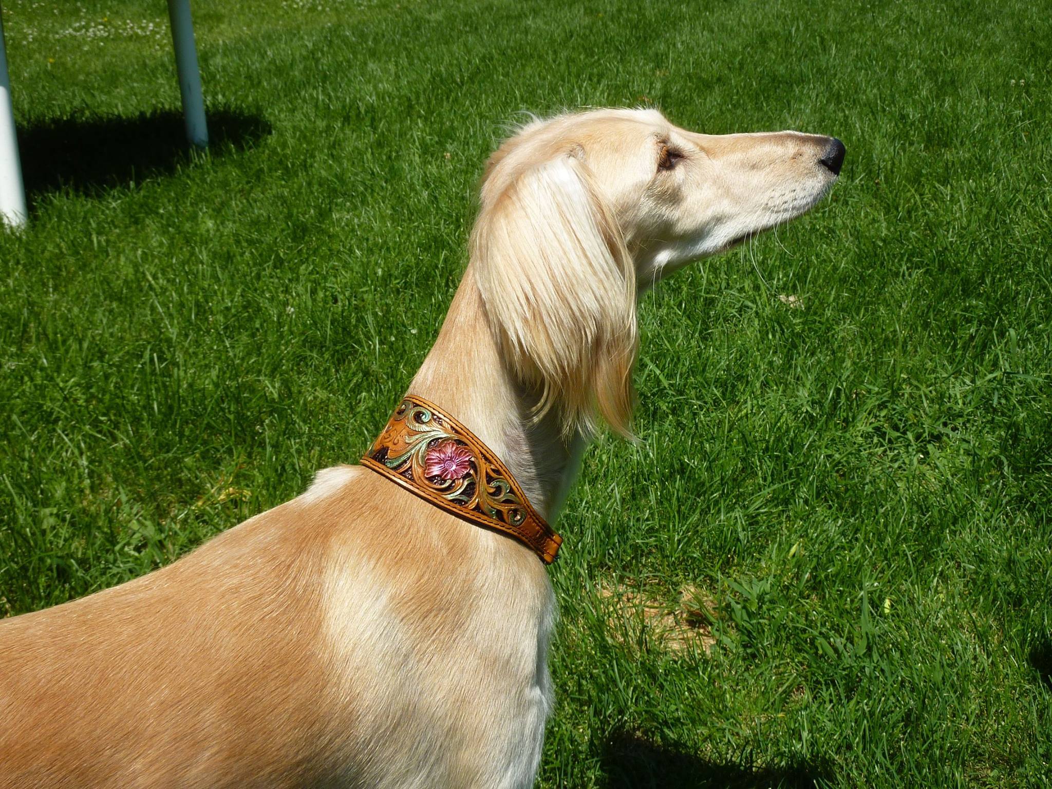 My leather dog collars are worn by dogs of all sizes in many countries, have been worn by a dog posing in a magazine, and a custom-text collar has even been used as a tool in a marriage proposal. This request was another unusual one.. I was to craft prize collars to go to the winning dogs in the Saluki Club of Canada Specialty of 2015 in Jerseyville Ontario. I LOVE SALUKIS (as my site and store name might suggest). What a unique opportunity!